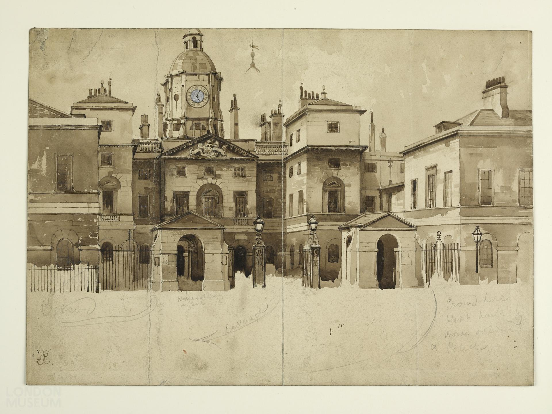 Sketch of Horse Guards, drawn at the time of the Duke of Wellington's Funeral, 18 November 1852. Annotations in pencil below image.