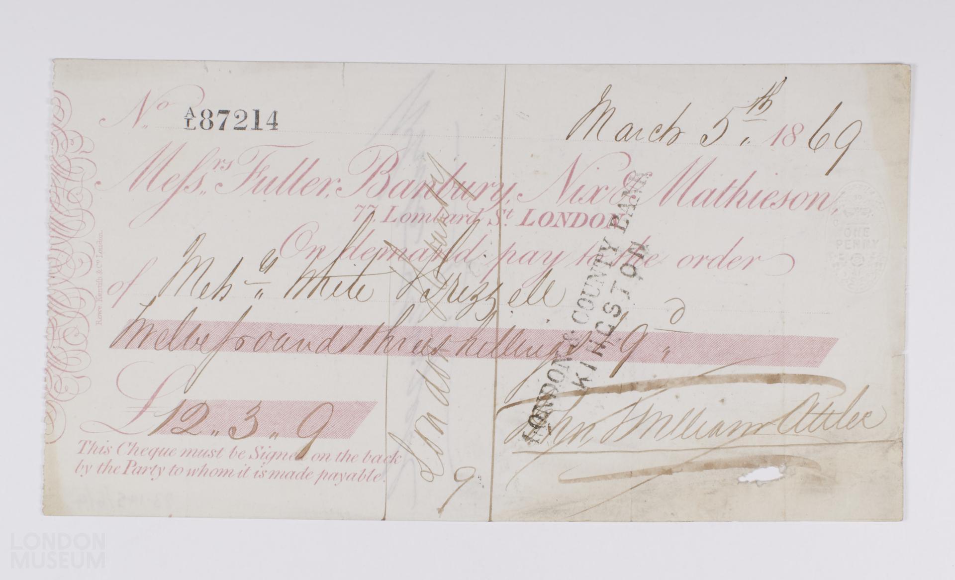 Cheque issued on 5th March 1869. Cheque is issued by Messrs Fuller, Banbury, Nix & Mathieson, 77 Lombard Street London, and the cheque is number AT 87214. The cheque has a one penny stamp. The person who the cheque is made out to and the amount are illegible.