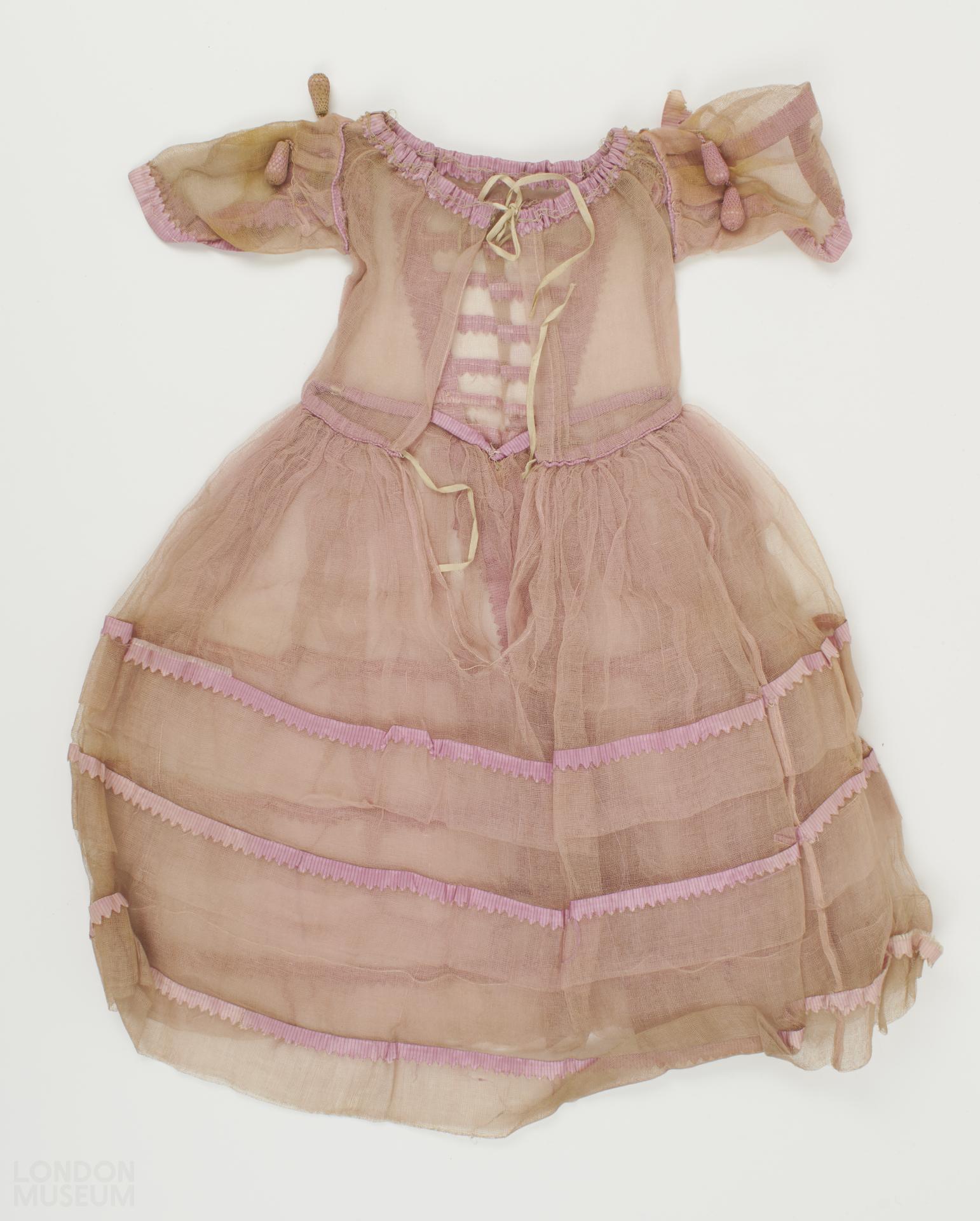 Doll's pink tarlatan dress trimmed with pink silk ribbon and crocheted tassels on the sleeves (lined with silk). The dress features two ties for fastening at the back.