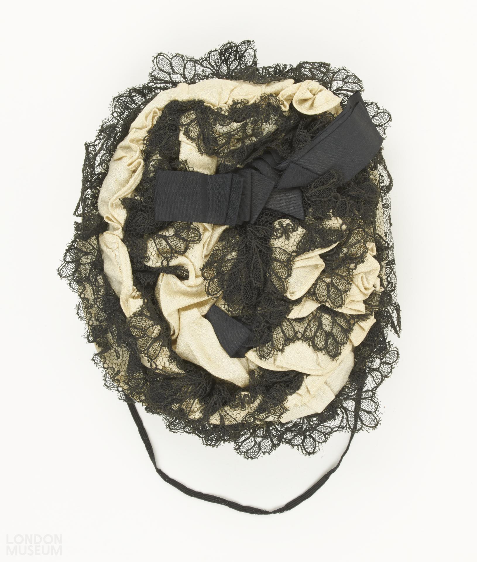 White silk cap trimmed with black lace and ribbons with black elastic chin strap.