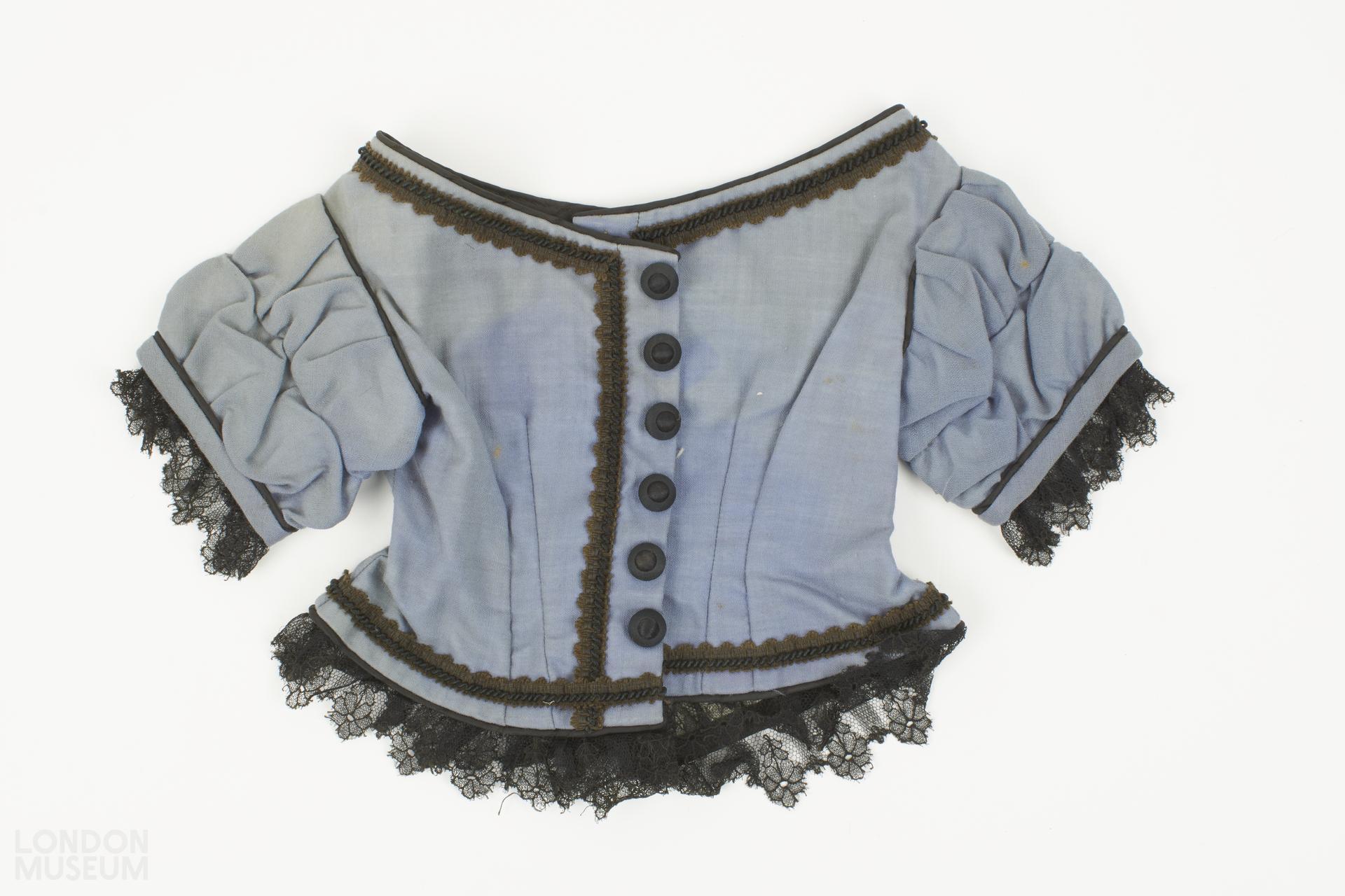 An evening bodice edged with black lace. Fastens at centre front with hooks and eyes and six decorative buttons. With white cotton lining. Most likely was once purple and has faded to blue.