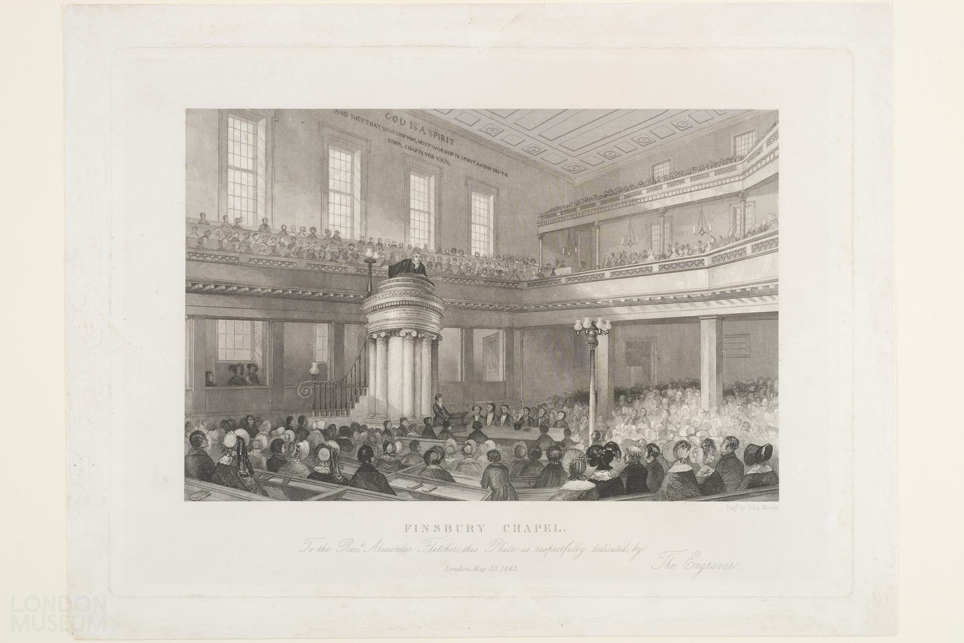 Interior of Finsbury Chapel, showing the congregation listening to a sermon by the Rev Alexander Fletcher, to whom this plate is inscribed by the engraver.