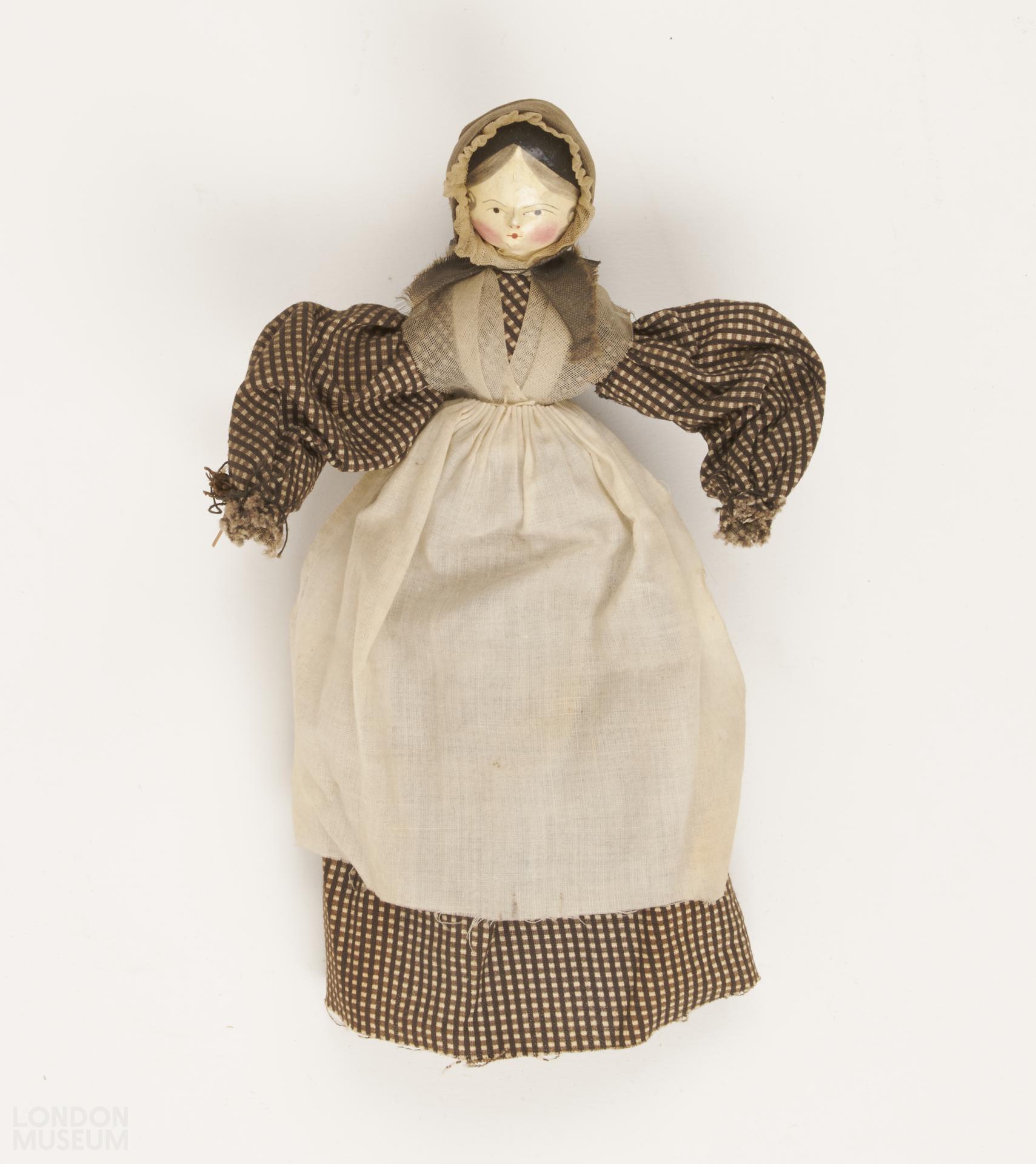 Mother doll with a broom of twigs in one hand and is dressed in cotton. Wooden with painted features. Wearing a brown and white gingham dress and a white apron and a brown coloured bonnet.
