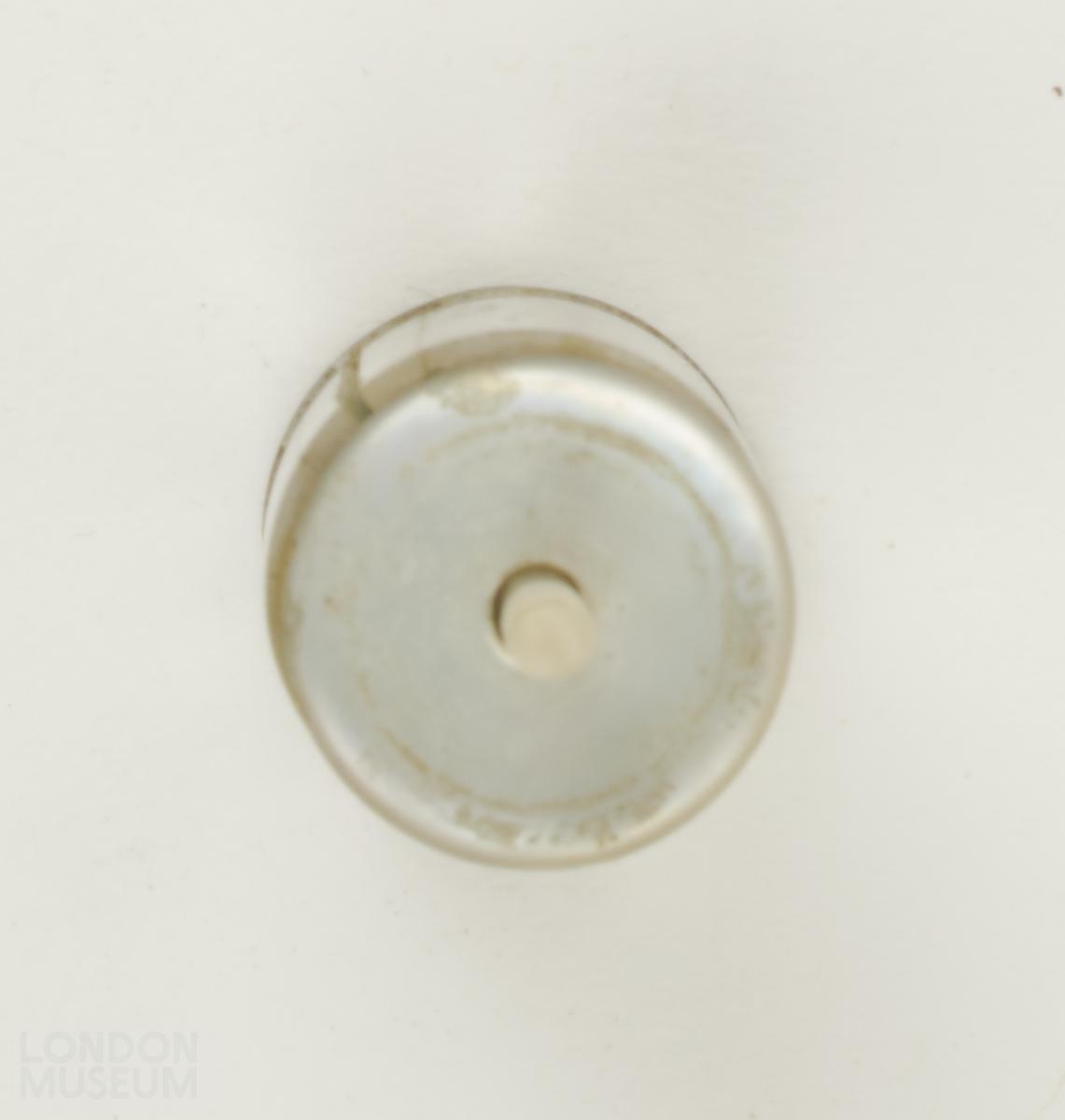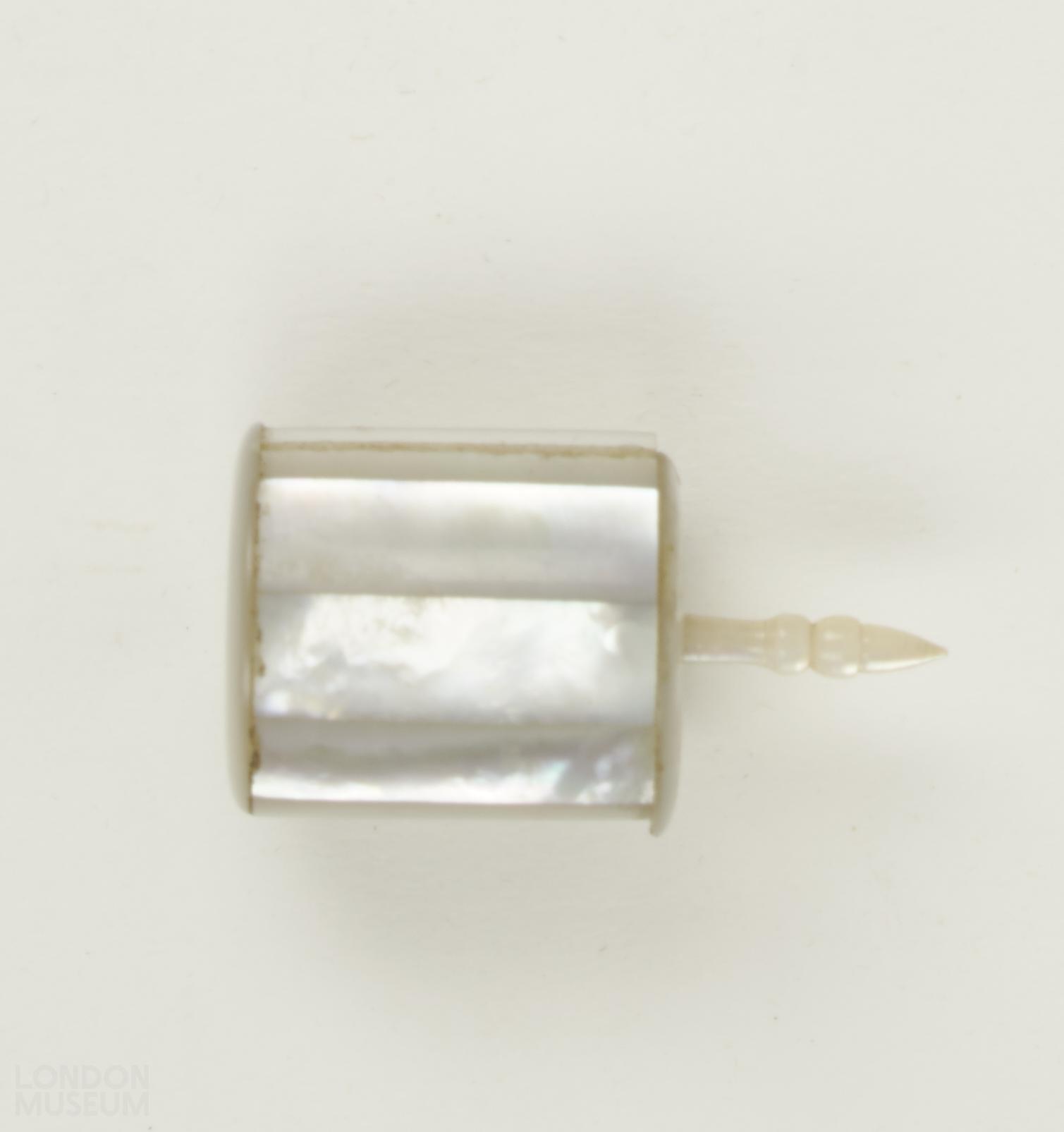Unidentified doll's accessory. Part of a shop front set up. Cylinder of mother-of-peal with a pointed spike coming from the top.