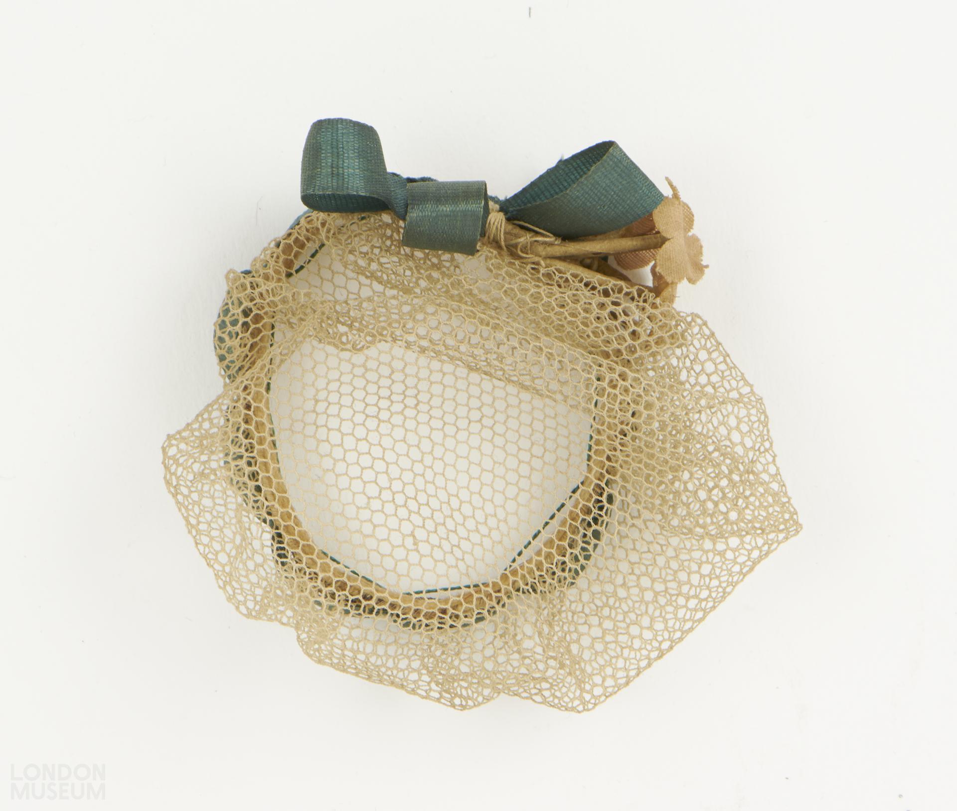 Doll's cap with cotton netting adhered to a band of card and green coloured ribbon. With textile flowers adhered to the front.