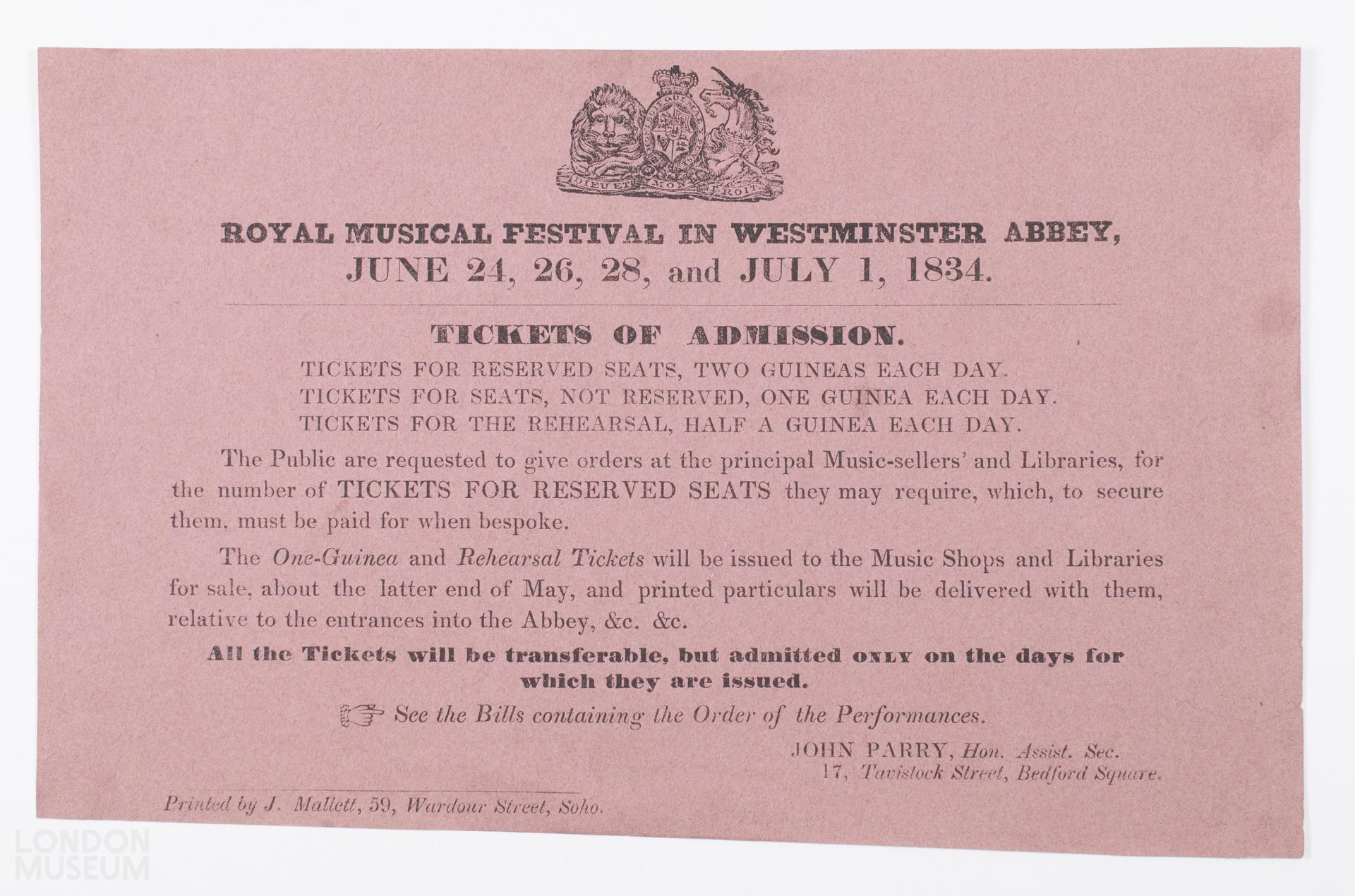 Notice announcing ticket prices for the Royal Musical Festival to be held in Westminster Abbey, on June 24, 26, 28 and July 1, 1834. Printed on pink paper the notice, printed by J. Mallet, 59 Wardour Street, also includes the Royal Coat of Arms and provides details of how and where members of the public are able to order and purchase tickets.