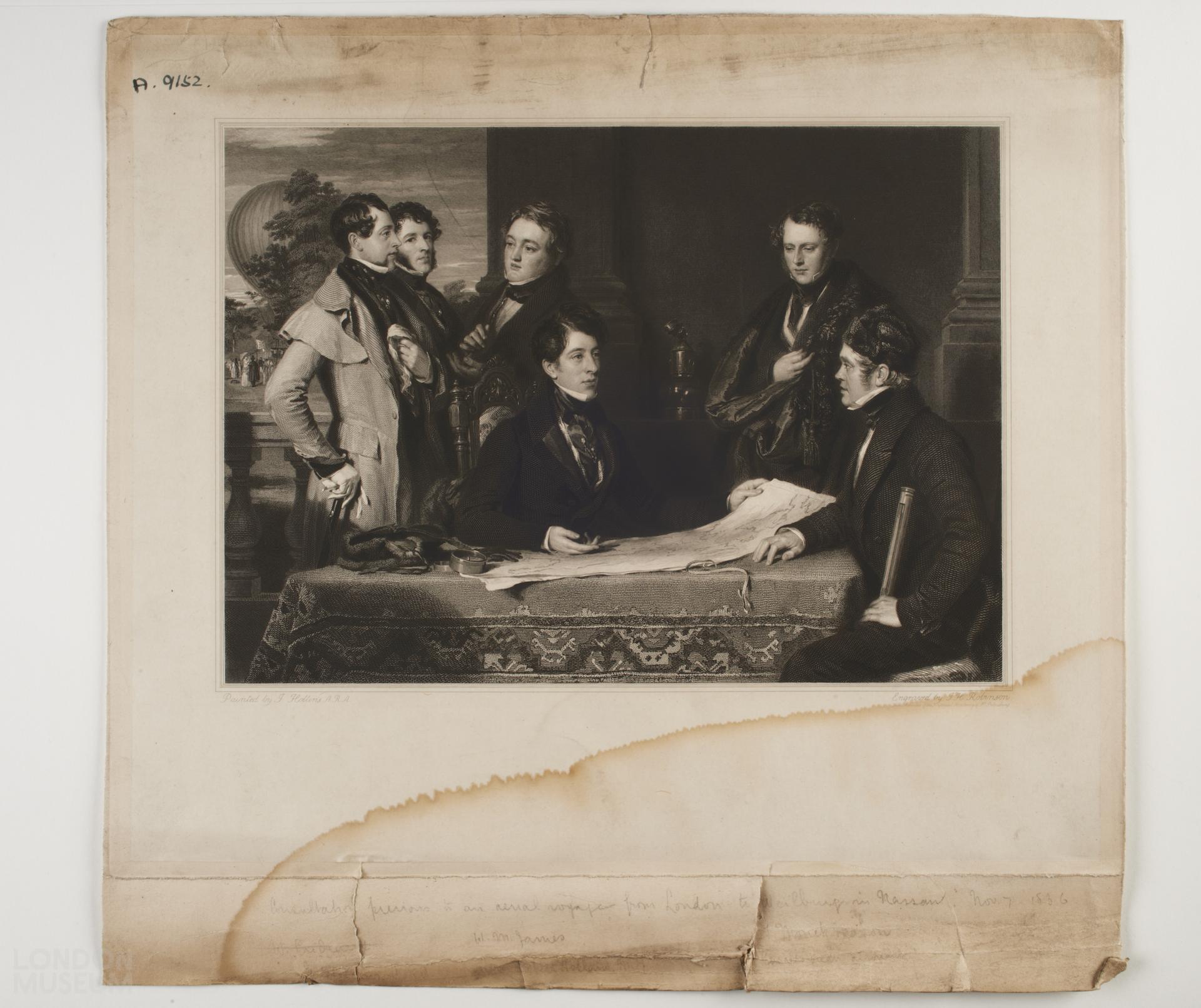 Aeronauts - a pencil note on the border reads "Consultation previous to an aerial voyage from London to Weilburg in Nassau, Nov. 7 1836" and adds a key to the six figures in the picture (interior, with balloon seen through window), three of which are now illegible, the others being: W Crideaux, W M James, J Monck Mason.