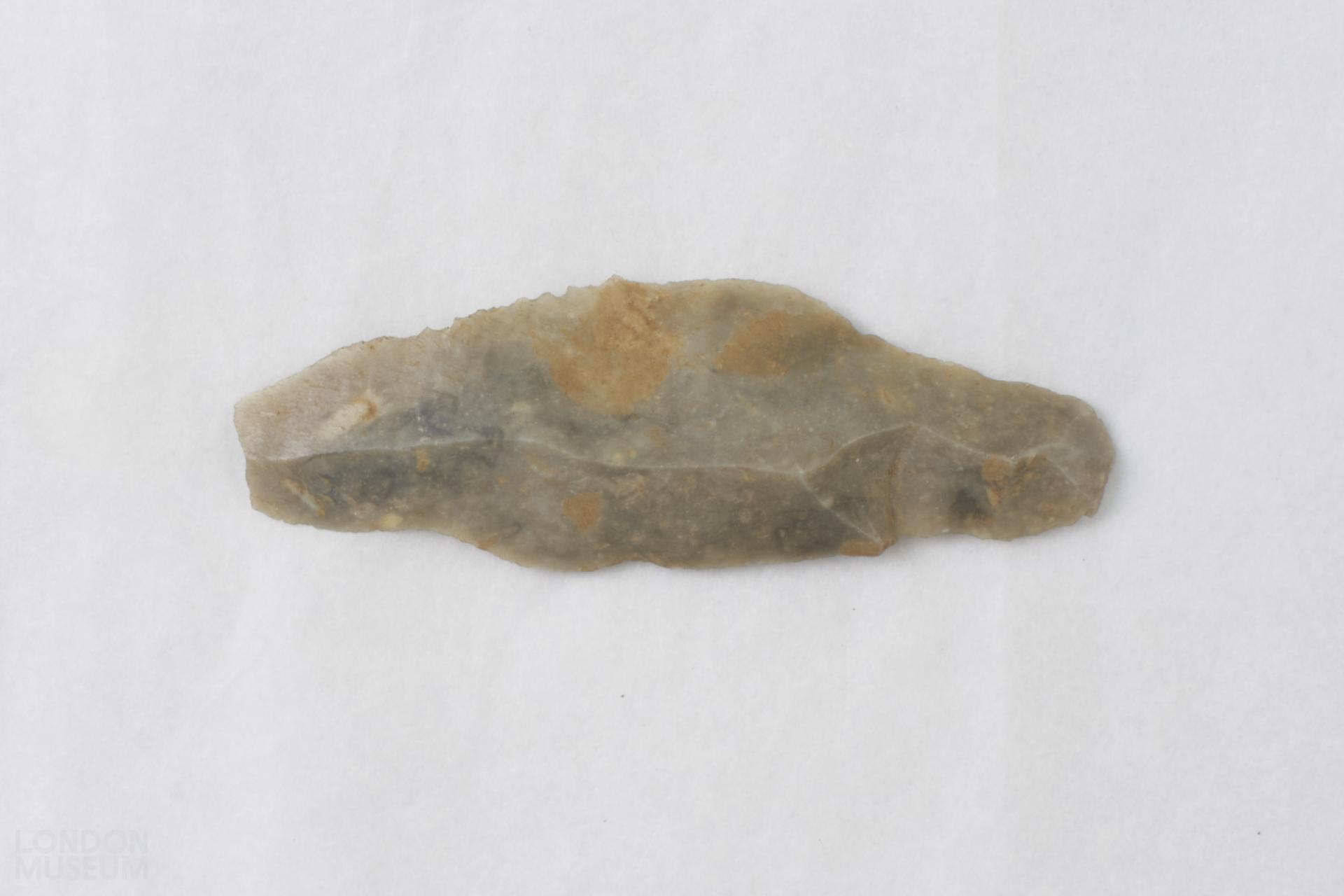 Flint blade with triangular cross-section of mottled light grey flint.