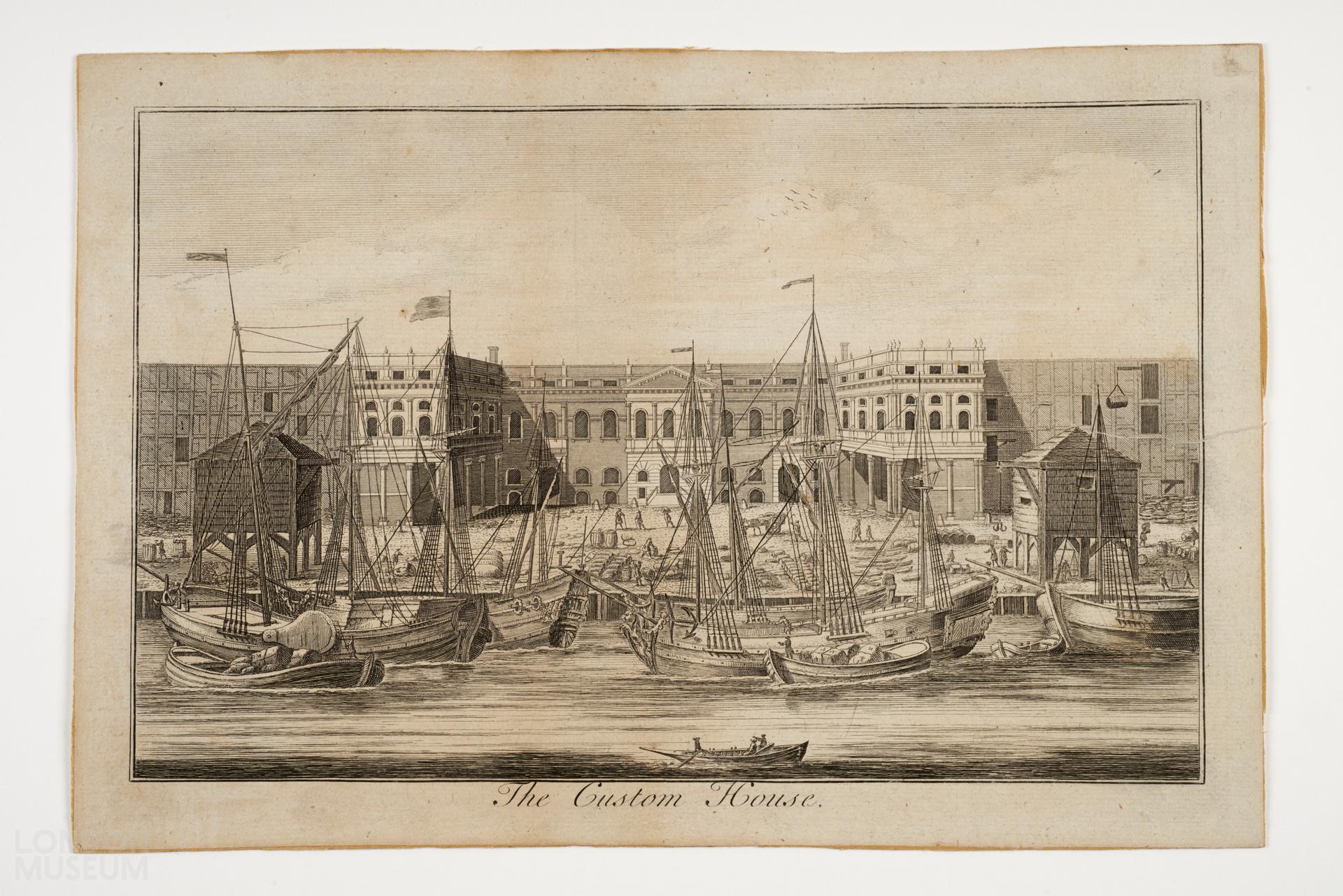 The Custom House, rebuilt by Thomas Ripley in 1717-25 on the site of Wren's building (damaged in 1714 by a gunpowder explosion). This building, which burnt down in 1814, was to the east of the present one. It is seen behind the masts of shipping on the river and there are goods laid out on the foreshore. From Maitlands History of London. Same engraving (but later imprint?) as Z6854 - it lacks the engraver's name and the title encroaches on the picture.