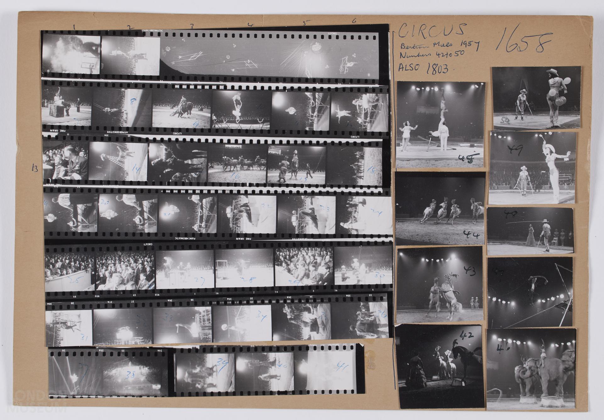 One contact sheet titled 'Bertram Miles Circus', 1957: Images depict circus performers and audience shots. 35mm (1-41), 6x6cm (42-50). Note reads 'see also HG1803'.