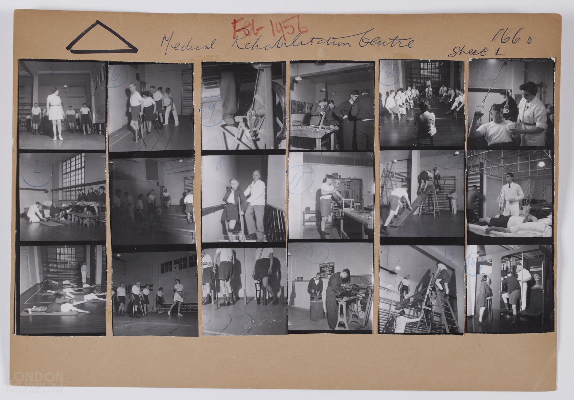 One of three contact sheets titled 'Medical Rehabilitation Centre', -/2/1956: images depict various shots of patients exercising. Contact sheet one images are numbered 1-18. 6x6cm.