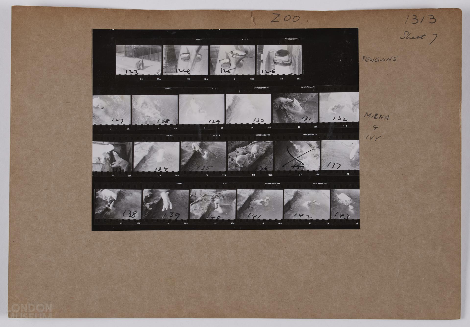 Animals at London Zoo, n.d.: including children handling small animals. 6x6 cm (1-9, 13-48) and 35 mm (50-143). 7 of 7 sheets. Notes on back of sheet 2.