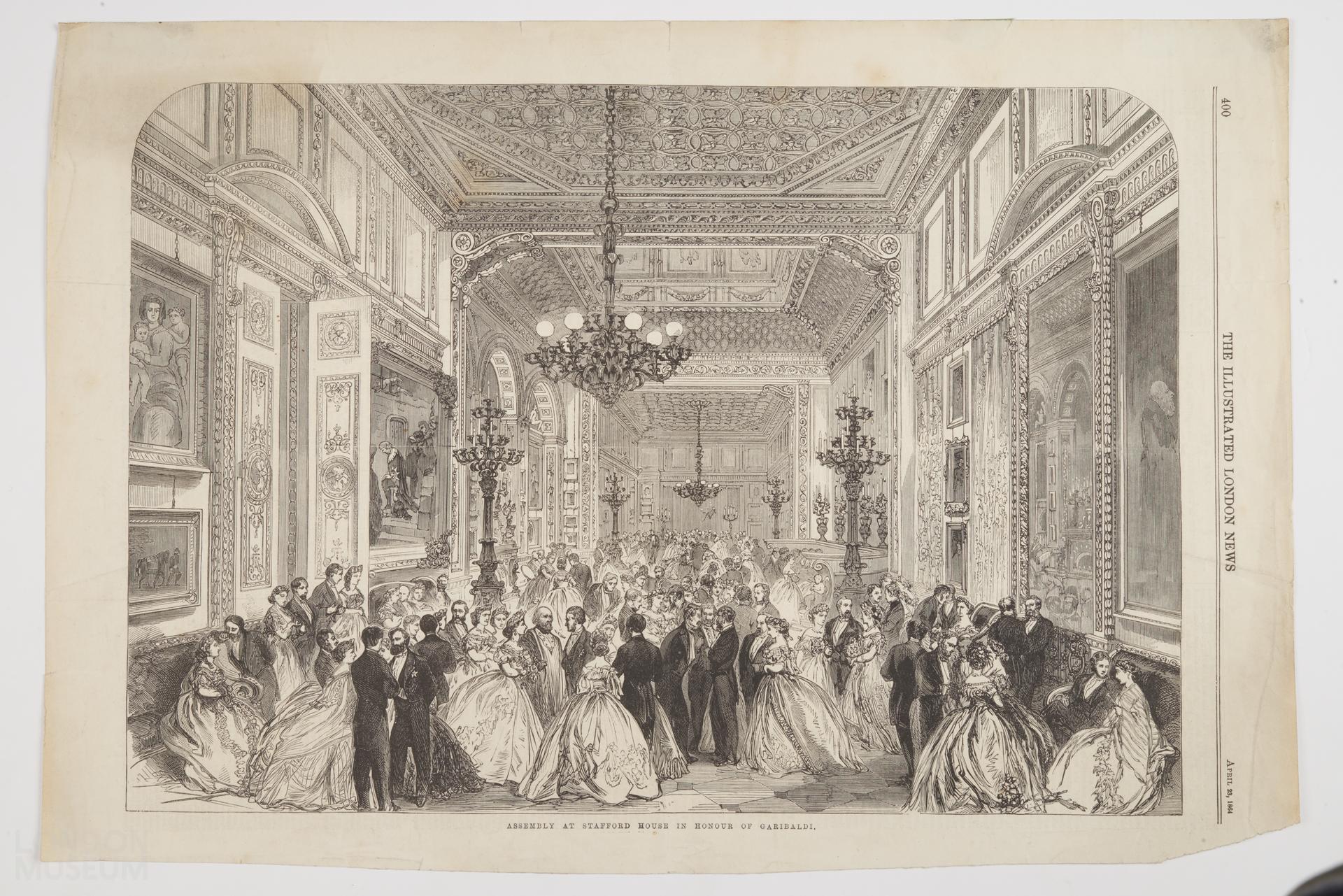 Assembly at Stafford House in honour of Garibaldi - cutting from Illustrated London News. Stafford House, owned at the time by the 2nd duke of Sutherland (the first duke was previously the Marquess of Stafford) was a rallying point for Whigs and liberals. (The house was renamed Lancaster House when bought by Lord Leverhulme in 1912; given to the nation by him in 1913, and home of the Museum of London until 1946).
